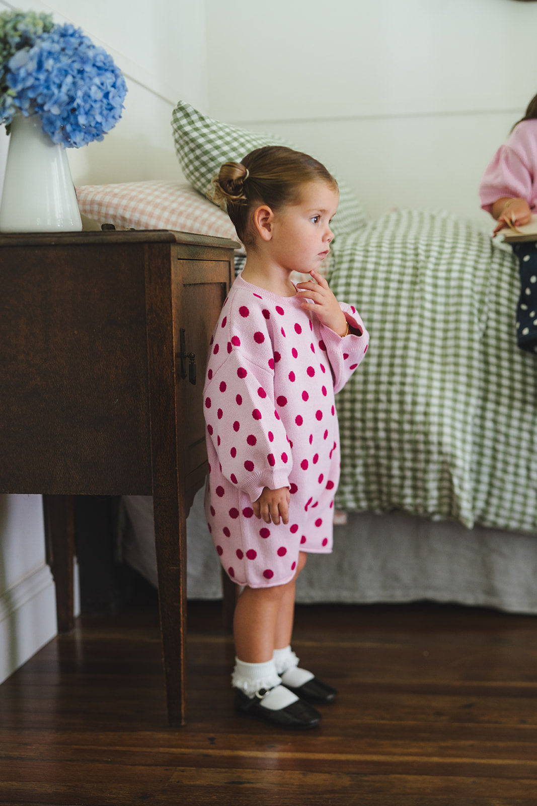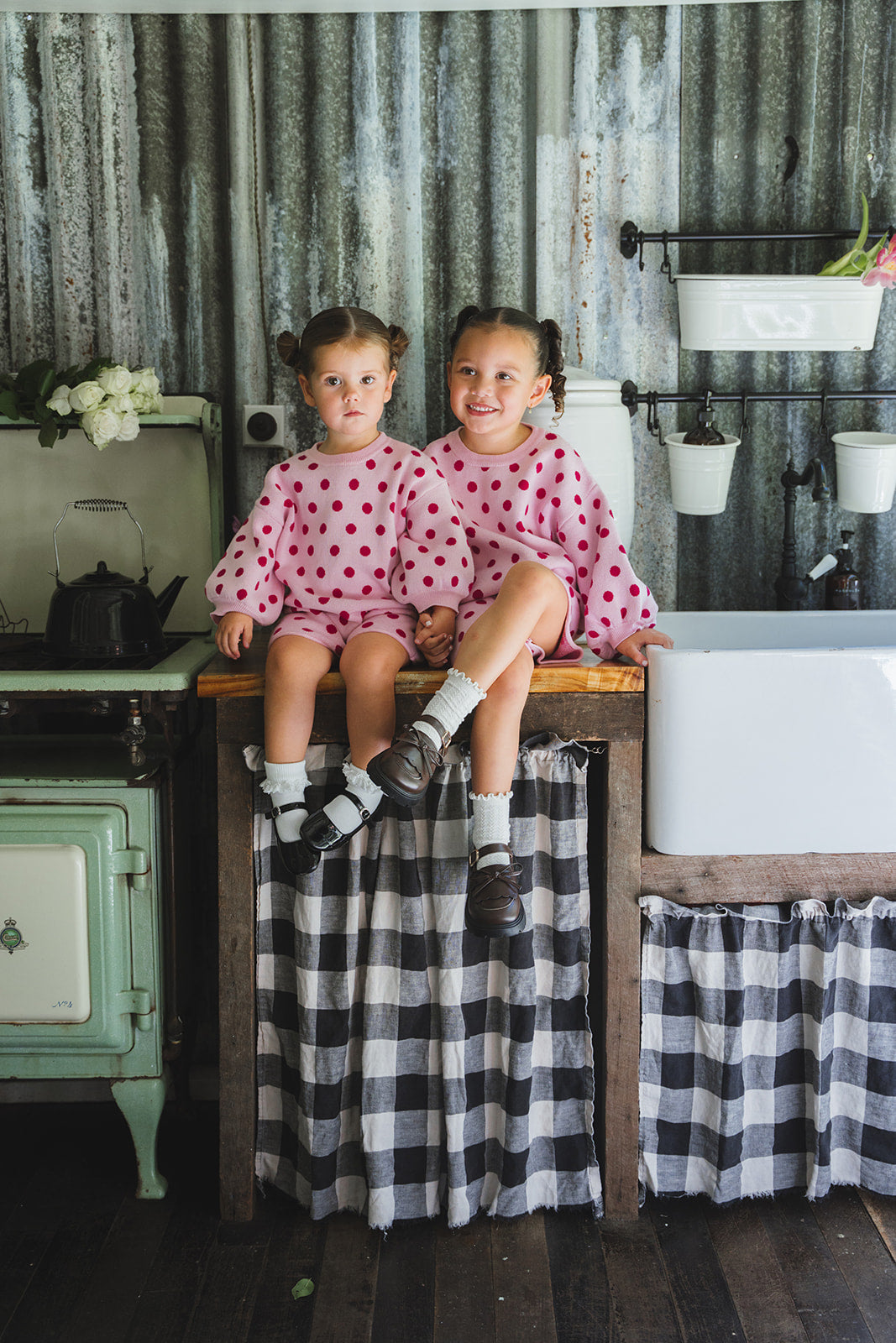 Meet our Lucie Knit Romper, featuring sweet balloon sleeves in our petal pink and raspberry polka dot print—a true Myla Jane signature.