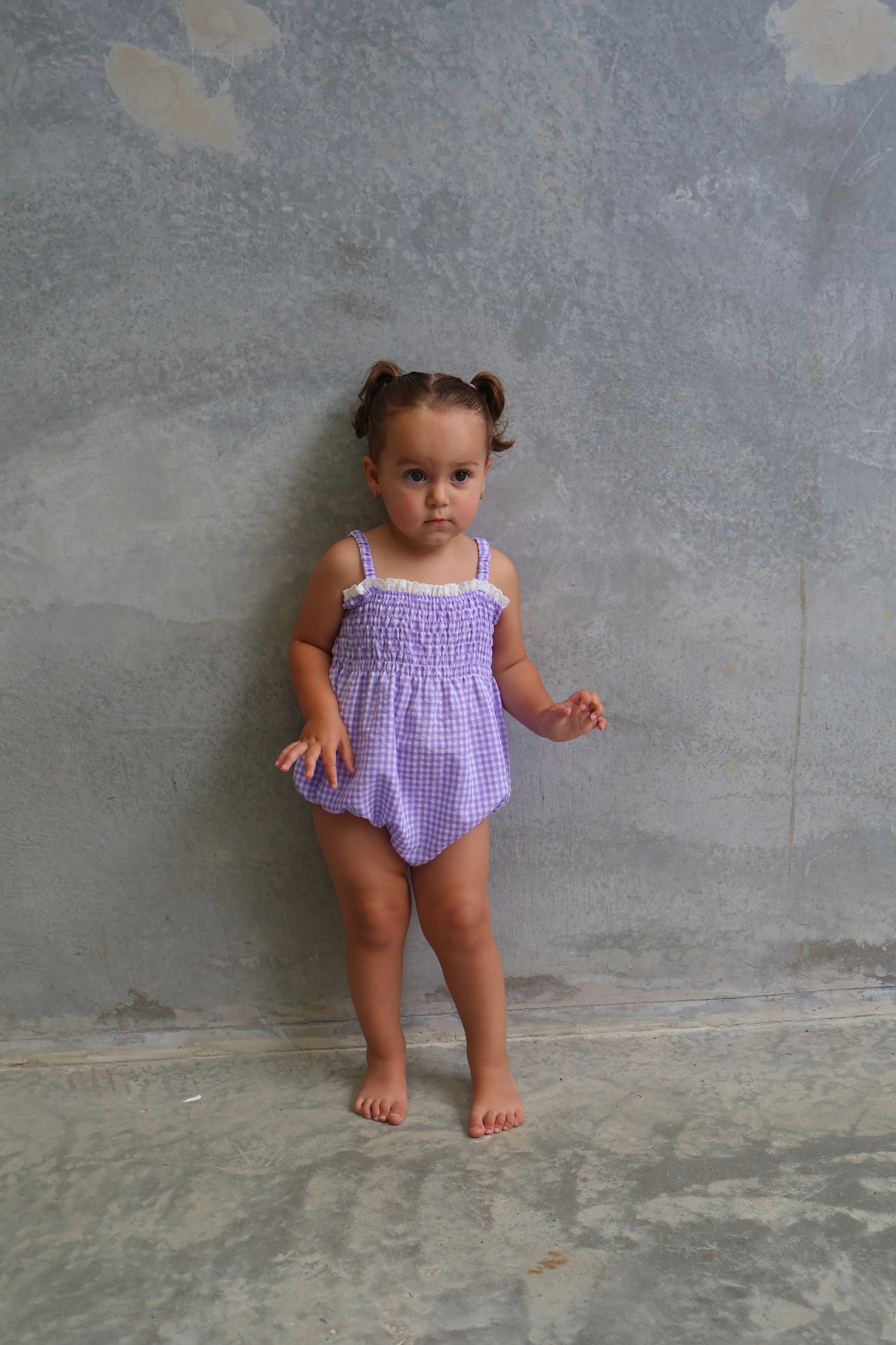 Introducing our new Posie Romper in Lilac Gingham. Crafted from soft, breathable cotton, this romper features a sweet lilac gingham print paired with our pretty flower lace detailing on the neckline