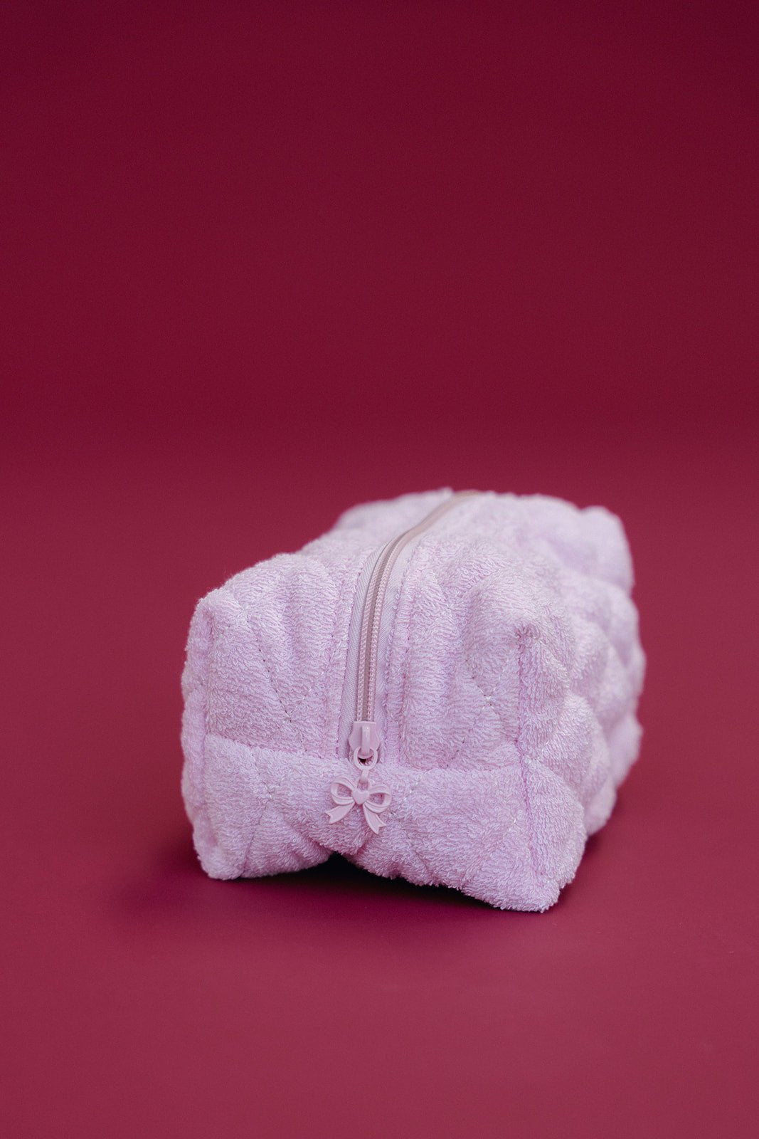 Made with the softest baby pink quilted terry towel, features our blind Myla Jane embroidery, a sweet heart bow zipper and Cherry gingham lining.